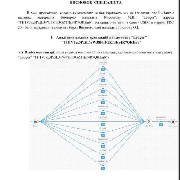 До рук журналістів потрапив номер криптогаманця Кисельова М., з якого, як він заявив у нього, вкрали гроші в сумі 647 000 USDT