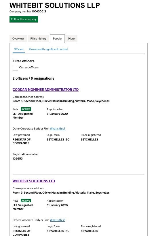 WhiteBIT пов'язаний зі спецслужбами Росії та допомагає їм вирішувати фінансові питання в різних країнах світу. Так, у публікації на Cryptointelligence зазначається, що в структуру власності криптобіржі WhiteBIT входить компанія Coddan Nominee. Ця компанія є частиною великої офшорної мережі та була серед засновників іншої фірми – Sofbiz.