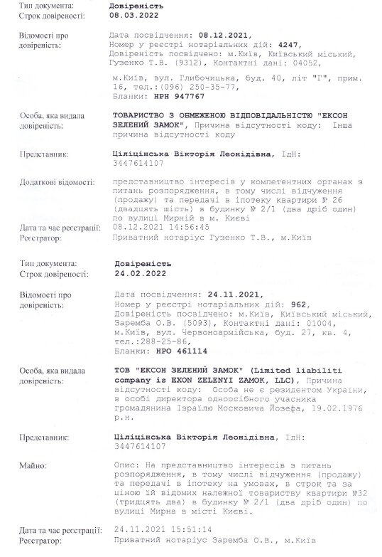 Вона є співзасновником ОК «ЖБК „Зелений Замок“, а також діє за довіреністю від Йозефа Московича, виданої 24.11.2021 та 08.12.2021, з правом розпорядження квартирами №26 та №32 по вул. Мирна, 2/1.