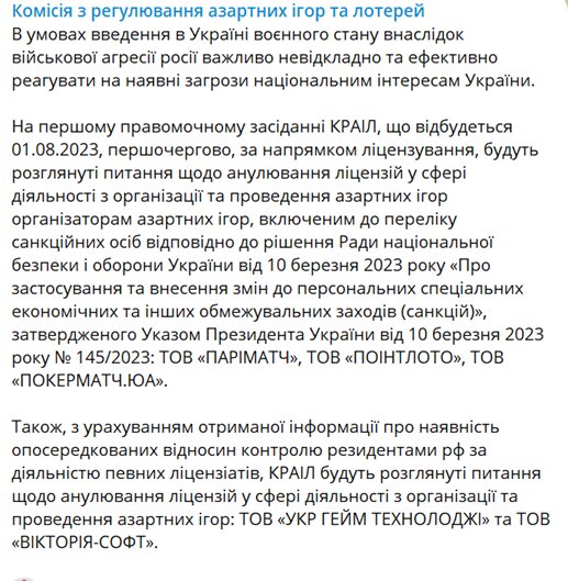 На засіданні члени комісії прийняли рішення припинити дію ліцензії ТОВ «ВІКТОРІЯ-СОФТ» але повністю проігнорували та не взяли до уваги діяльність ТОВ «УКР ГЕЙМ ТЕХНОЛОДЖІ» заливши їй можливість спокійно працювати в Україні й надалі.