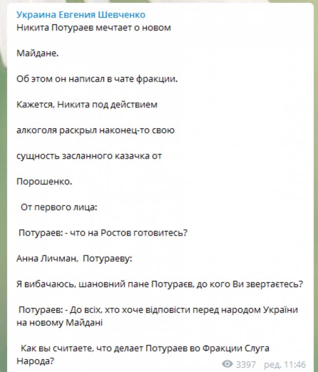 27 жовтня удень депутат від "Слуги народу" Євген Шевченко написав у Telegram-каналі, що його колега по фракції Микита Потураєв начебто "мріє про новий Майдан".
