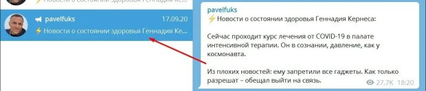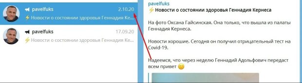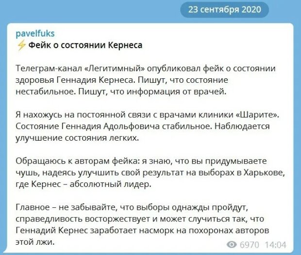 23 вересня Павло Фукс "наїхав" на Telegram-канал "легітимний", заявивши, що той опублікував фейк про стан здоров'я Геннадія Кернеса.