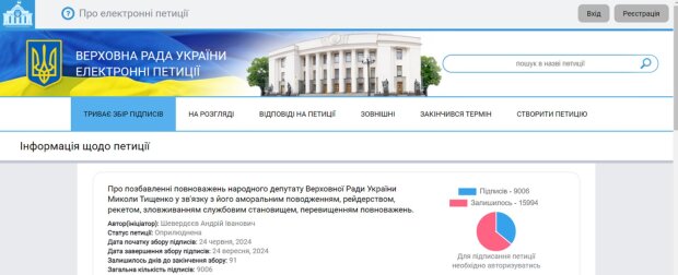Петиция по лишению полномочий народного депутата Верховной рады Украины Николая Тищенко в связи с его злоупотреблением служебным положением менее чем за сутки набрала половину необходимых голосов.