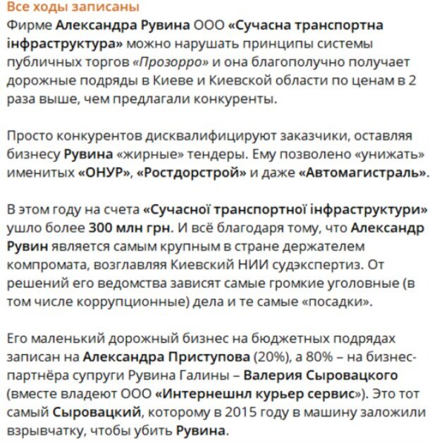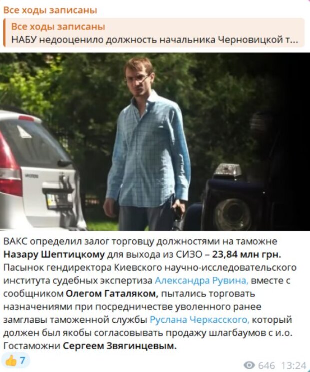 "Пасынок гендиректора Киевского научно-исследовательского института судебных экспертиза Александра Рувина, вместе с сообщником Олегом Гаталяком, пытались торговать назначениями при посредничестве уволенного ранее замглавы таможенной службы Руслана Черкасского, который должен был якобы согласовывать продажу шлагбаумов с и.о. Гостаможни Сергеем Звягинцевым", - пишут авторы канала.