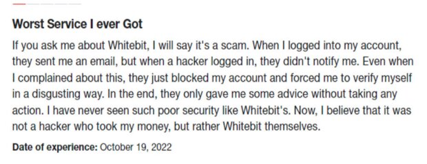 “Худший сервис, который я когда-либо использовал. Если вы спросите меня о Whitebit, я скажу, что это мошенничество. Когда я вошел в свой аккаунт, они отправили мне электронное письмо, но когда хакер вошел в систему, они не уведомили меня. Даже когда я пожаловался на это, они просто заблокировали мой аккаунт и заставили меня верифицировать себя отвратительным образом. В итоге они только дали мне несколько советов, не предприняв никаких действий. Я никогда не видел такой плохой безопасности, как у Whitebit. Теперь я верю, что мои деньги забрал не хакер, а сама компания Whitebit”.