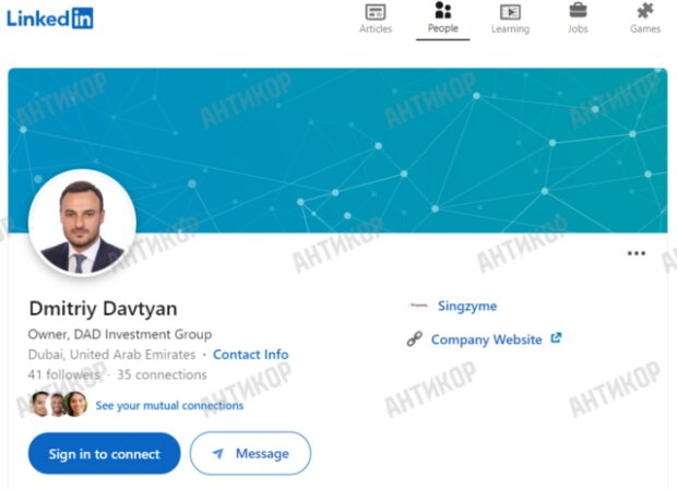 В его профиле на LinkedIN указано, что он является представителем DAD Investment Group. Это компания его отца — Александра Давтяна. Однако Дмитрий постоянно лайкает публикации от Enso investment в Дубае.