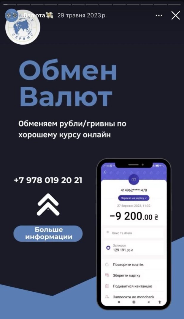 Помимо транспорта компания организует нелегальные финансовые операции. Клиенты могут перевести средства на украинскую карточку, после чего деньги доставляются в РФ или на оккупированные территории наличными. Такие денежные схемы работают вне закона и могут употребляться для финансирования враждебных структур.