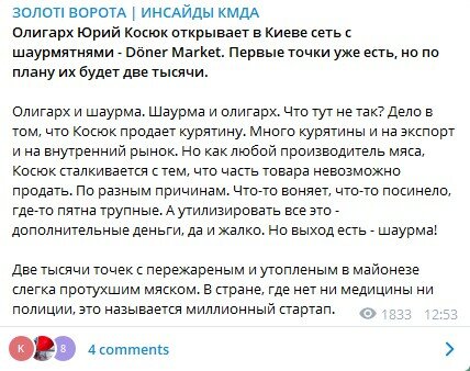 ПодписатьсяОлигарх и шаурма. Шаурма и олигарх. Что тут не так? Дело в том, что Косюк продает курятину. Много курятины и на экспорт и на внутренний рынок. Но как любой производитель мяса, Косюк сталкивается с тем, что часть товара невозможно продать. По разным причинам. Что-то воняет, что-то посинело, где-то пятна трупные. А утилизировать все это - дополнительные деньги, да и жалко. Но выход есть - шаурма! Две тысячи точек с пережареным и утопленым в майонезе слегка протухшим мяском. В стране, где нет ни медицины ни полиции, это называется миллионный стартап.