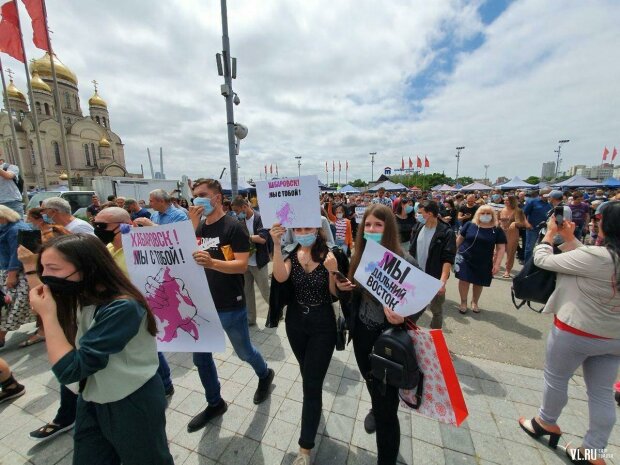 Улицы города заполонили протестующие: они держали в руках плакаты "Я, мы, Дальний Восток", "Хабаровск, мы с тобой", "Нет издевательству над народом" и так далее.