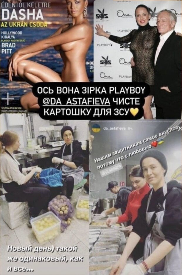 Відома модель, співачка та колишня зірка Playboy Даша Астаф'єва допомагає ЗСУ. Вона разом з іншими дівчатами та жінками чистить картоплю для наших захисників. Даша просто молодець!
