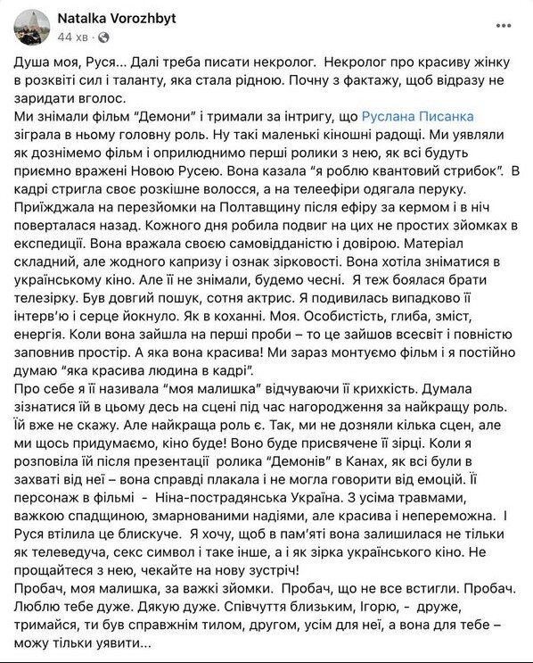 «Вона хотіла зніматись в українському кіно. Але її не знімали, будемо чесними. Я також боялася брати телезірку. Був довгий пошук, сотня акторок. Коли вона зайшла на перші спроби — це зайшла всесвіт і повністю заповнила простір. Я хочу, щоб у пам'яті вона залишилася не лише як телеведуча, секс-символ тощо, а й як зірка українського кіно. Не прощайтеся з нею, чекайте на нову зустріч!», — написала Наталія Ворожбит у Фейсбуці.