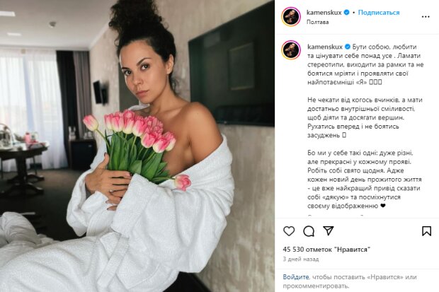 У підписі знаменитість підкреслила, наскільки важливо бути вірною собі, любити і цінувати себе, ламати стереотипи, виходити за рамки і не боятися мріяти чи розкривати свою потаємну сутність. Каменських закликала своїх послідовників діяти внутрішньо сміливо, рухатися вперед і не боятися осуду, адже всі люди різні, але неповторно прекрасні.