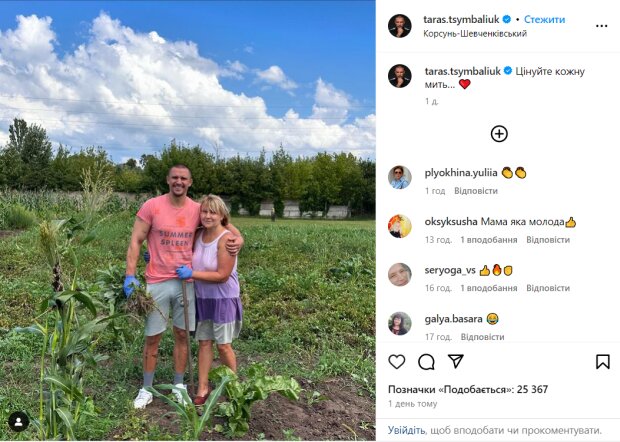 Секс-символ українського кінематографу Тарас Цимбалюк відвідав своїх родичів у Корсунь-Шевченківському на Черкащині. Він поділився фотографією в Instagram, що зафіксувала момент із матір'ю на городі.