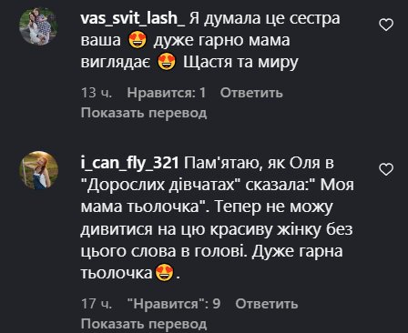 «Я думала це сестра ваша дуже гарно мама виглядає Щастя та миру», «Пам'ятаю, як Оля в "Дорослих дівчатах" сказала:" Моя мама тьолочка". Тепер не можу дивитися на цю красиву жінку без цього слова в голові. Дуже гарна тьолочка» , — пишуть відгуки українці.