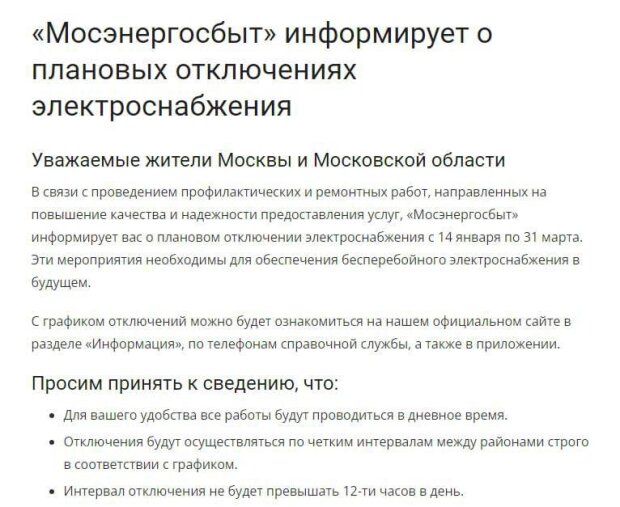 А ось 12 січня з'явилися нові новини про те, що в Москві вводяться графіки відбиття світла. На тлі комунального колапсу в Росії, де через постійні прориви труб вулиці затоплює окропом і нечистотами, а громадяни замерзають у власних будинках, навіть мешканцям столиці доведеться посидіти без світла. Напевно, їм і зараз вірно .